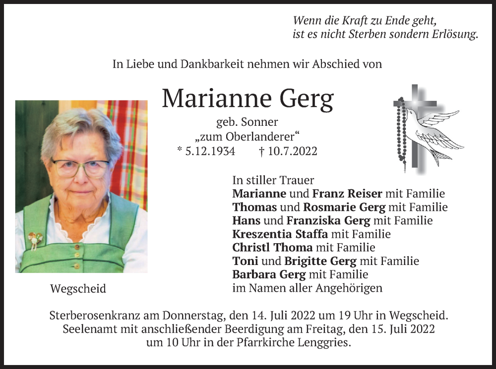 Hier finden Sie alle Traueranzeigen aus der Zeitung, die bisher für Marianne Gerg erschienen sind. Weitere Traueranzeigen, die in der Zeitung erscheinen, werden hier ebenfalls aufgelistet