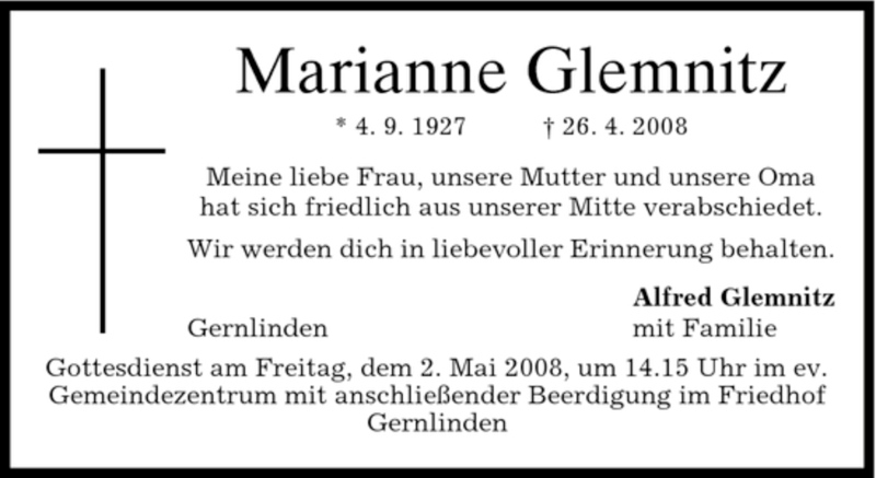 Hier finden Sie alle Traueranzeigen aus der Zeitung, die bisher für Marianne Glemnitz erschienen sind. Weitere Traueranzeigen, die in der Zeitung erscheinen, werden hier ebenfalls aufgelistet