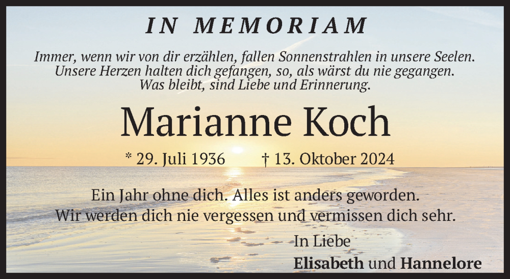 Hier finden Sie alle Traueranzeigen aus der Zeitung, die bisher für Marianne Koch erschienen sind. Weitere Traueranzeigen, die in der Zeitung erscheinen, werden hier ebenfalls aufgelistet