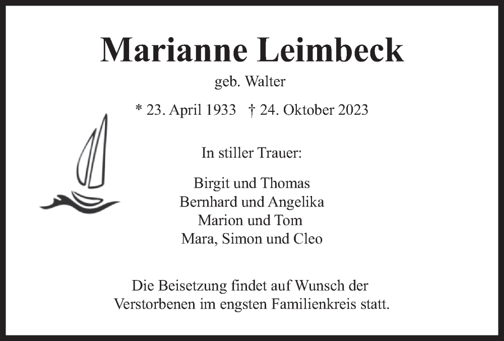 Hier finden Sie alle Traueranzeigen aus der Zeitung, die bisher für Marianne Leimbeck erschienen sind. Weitere Traueranzeigen, die in der Zeitung erscheinen, werden hier ebenfalls aufgelistet