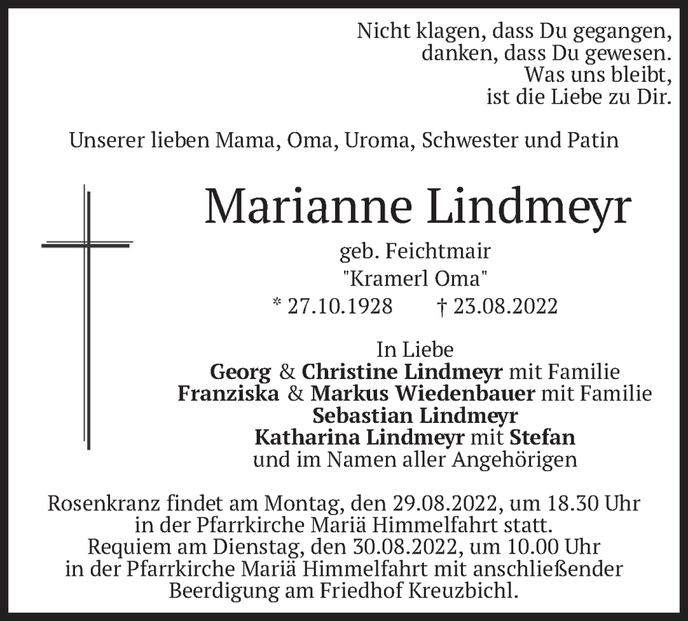 Hier finden Sie alle Traueranzeigen aus der Zeitung, die bisher für Marianne Lindmeyr erschienen sind. Weitere Traueranzeigen, die in der Zeitung erscheinen, werden hier ebenfalls aufgelistet
