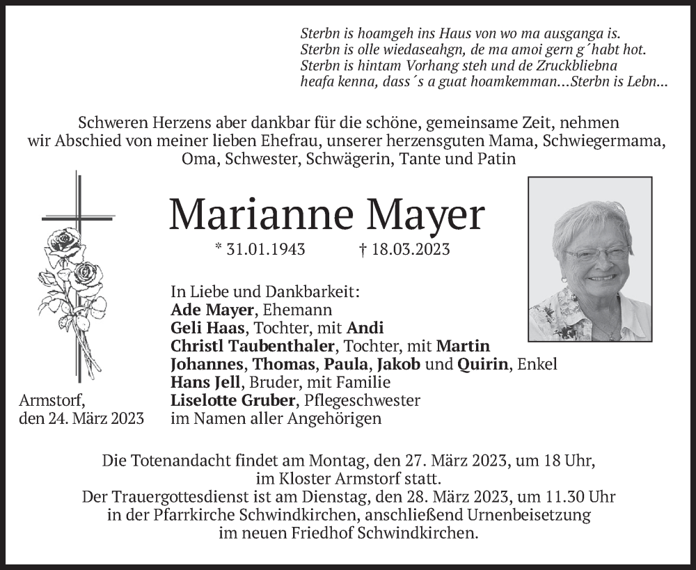 Hier finden Sie alle Traueranzeigen aus der Zeitung, die bisher für Marianne Mayer erschienen sind. Weitere Traueranzeigen, die in der Zeitung erscheinen, werden hier ebenfalls aufgelistet