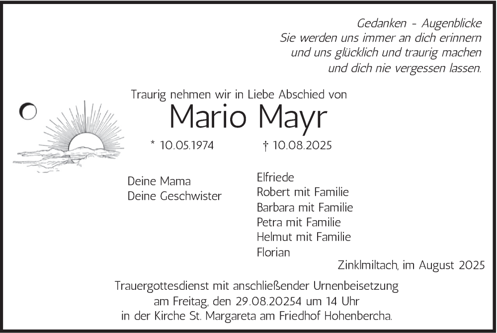 Hier finden Sie alle Traueranzeigen aus der Zeitung, die bisher für Mario Mayr erschienen sind. Weitere Traueranzeigen, die in der Zeitung erscheinen, werden hier ebenfalls aufgelistet