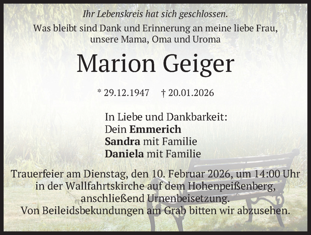 Hier finden Sie alle Traueranzeigen aus der Zeitung, die bisher für Marion Geiger erschienen sind. Weitere Traueranzeigen, die in der Zeitung erscheinen, werden hier ebenfalls aufgelistet