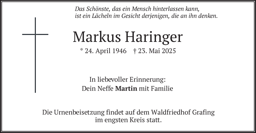 Hier finden Sie alle Traueranzeigen aus der Zeitung, die bisher für Markus Haringer erschienen sind. Weitere Traueranzeigen, die in der Zeitung erscheinen, werden hier ebenfalls aufgelistet