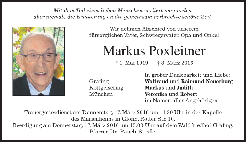 Hier finden Sie alle Traueranzeigen aus der Zeitung, die bisher für Markus Poxleitner erschienen sind. Weitere Traueranzeigen, die in der Zeitung erscheinen, werden hier ebenfalls aufgelistet