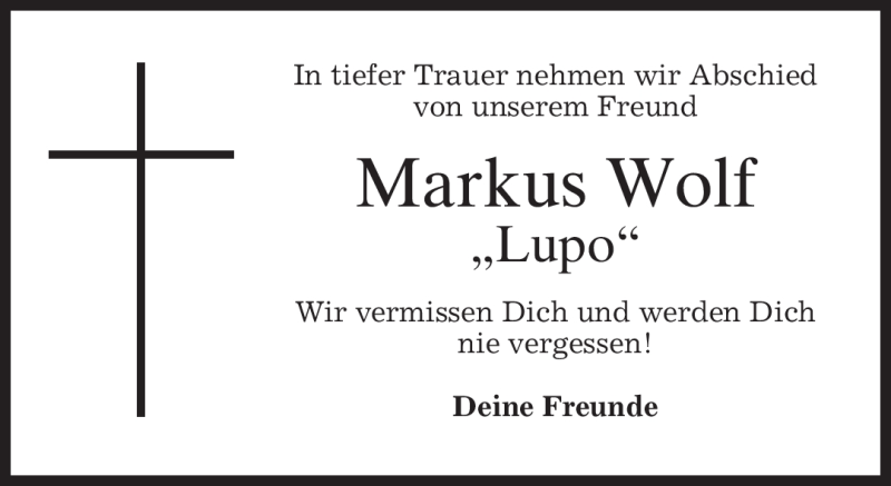 Hier finden Sie alle Traueranzeigen aus der Zeitung, die bisher für Markus Wolf erschienen sind. Weitere Traueranzeigen, die in der Zeitung erscheinen, werden hier ebenfalls aufgelistet
