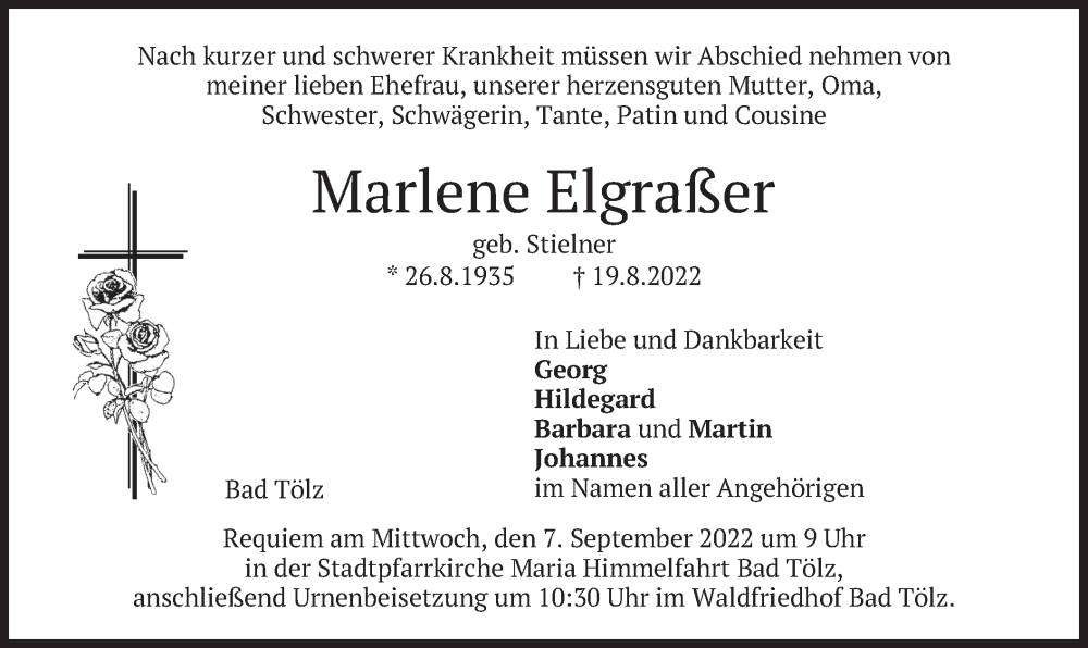 Hier finden Sie alle Traueranzeigen aus der Zeitung, die bisher für Marlene Elgraßer erschienen sind. Weitere Traueranzeigen, die in der Zeitung erscheinen, werden hier ebenfalls aufgelistet