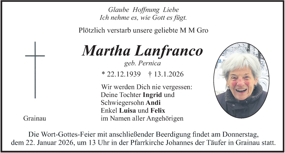 Hier finden Sie alle Traueranzeigen aus der Zeitung, die bisher für Martha Lanfranco erschienen sind. Weitere Traueranzeigen, die in der Zeitung erscheinen, werden hier ebenfalls aufgelistet