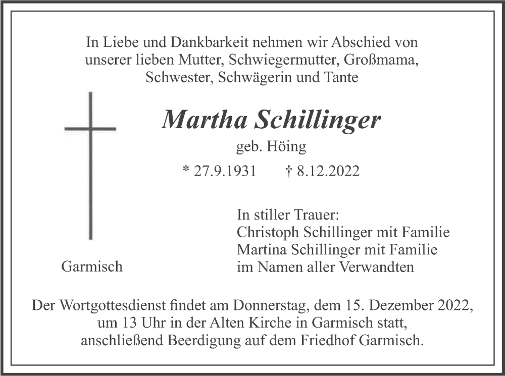 Hier finden Sie alle Traueranzeigen aus der Zeitung, die bisher für Martha Schillinger erschienen sind. Weitere Traueranzeigen, die in der Zeitung erscheinen, werden hier ebenfalls aufgelistet
