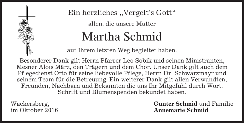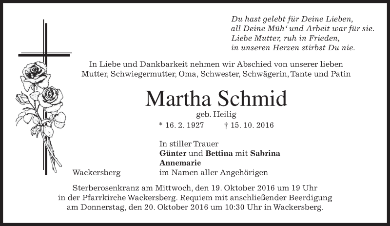 Hier finden Sie alle Traueranzeigen aus der Zeitung, die bisher für Martha Schmid erschienen sind. Weitere Traueranzeigen, die in der Zeitung erscheinen, werden hier ebenfalls aufgelistet