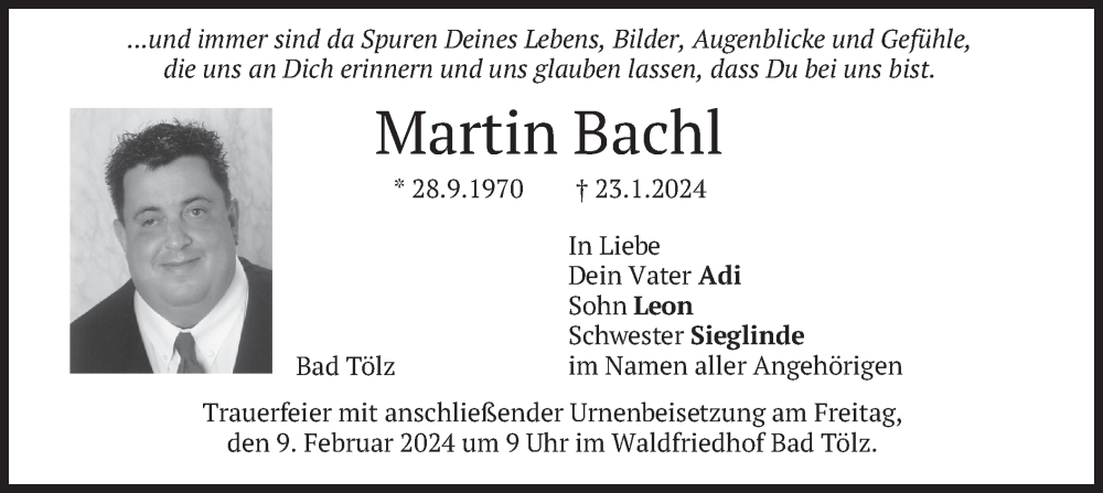 Hier finden Sie alle Traueranzeigen aus der Zeitung, die bisher für Martin Bachl erschienen sind. Weitere Traueranzeigen, die in der Zeitung erscheinen, werden hier ebenfalls aufgelistet