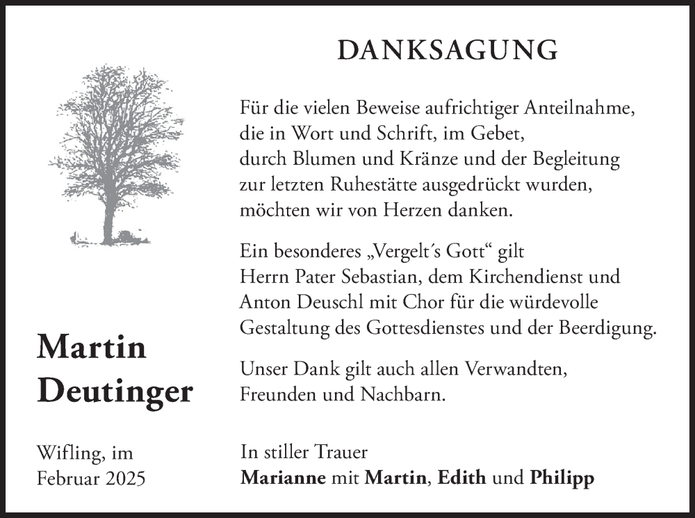 Hier finden Sie alle Traueranzeigen aus der Zeitung, die bisher für Martin Deutinger erschienen sind. Weitere Traueranzeigen, die in der Zeitung erscheinen, werden hier ebenfalls aufgelistet
