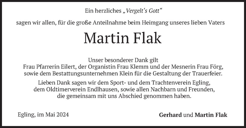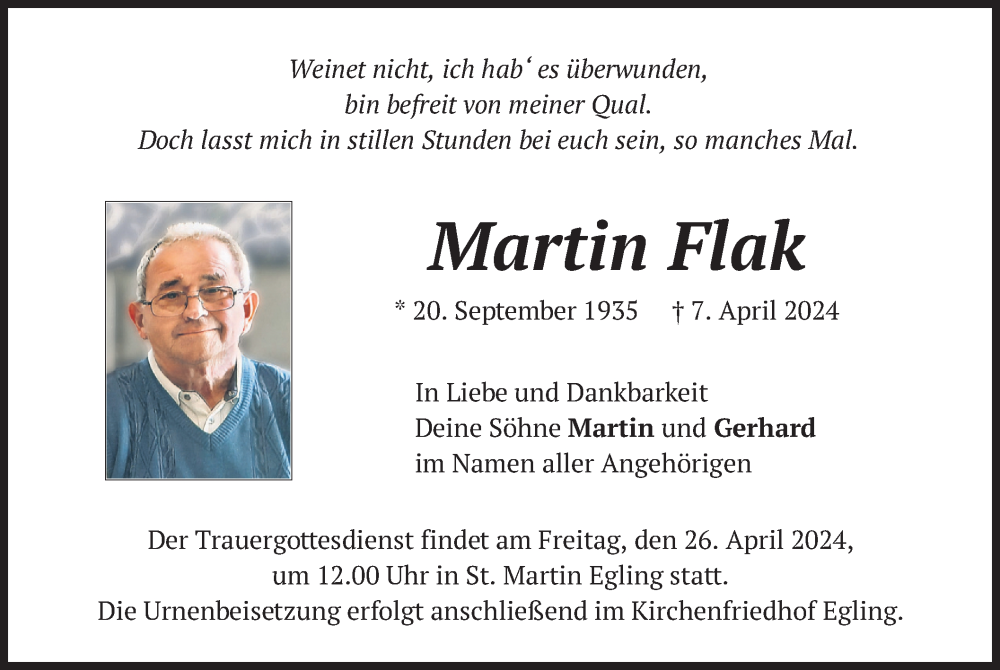 Hier finden Sie alle Traueranzeigen aus der Zeitung, die bisher für Martin Flak erschienen sind. Weitere Traueranzeigen, die in der Zeitung erscheinen, werden hier ebenfalls aufgelistet