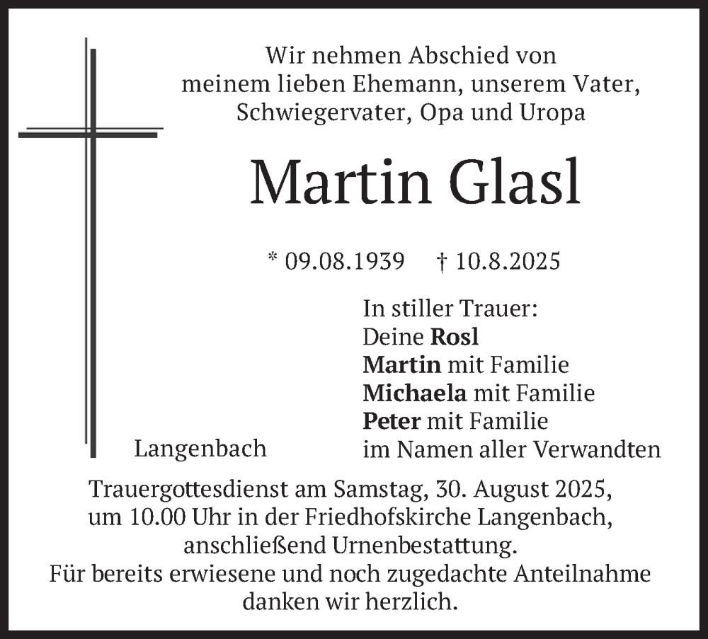 Hier finden Sie alle Traueranzeigen aus der Zeitung, die bisher für Martin Glasl erschienen sind. Weitere Traueranzeigen, die in der Zeitung erscheinen, werden hier ebenfalls aufgelistet