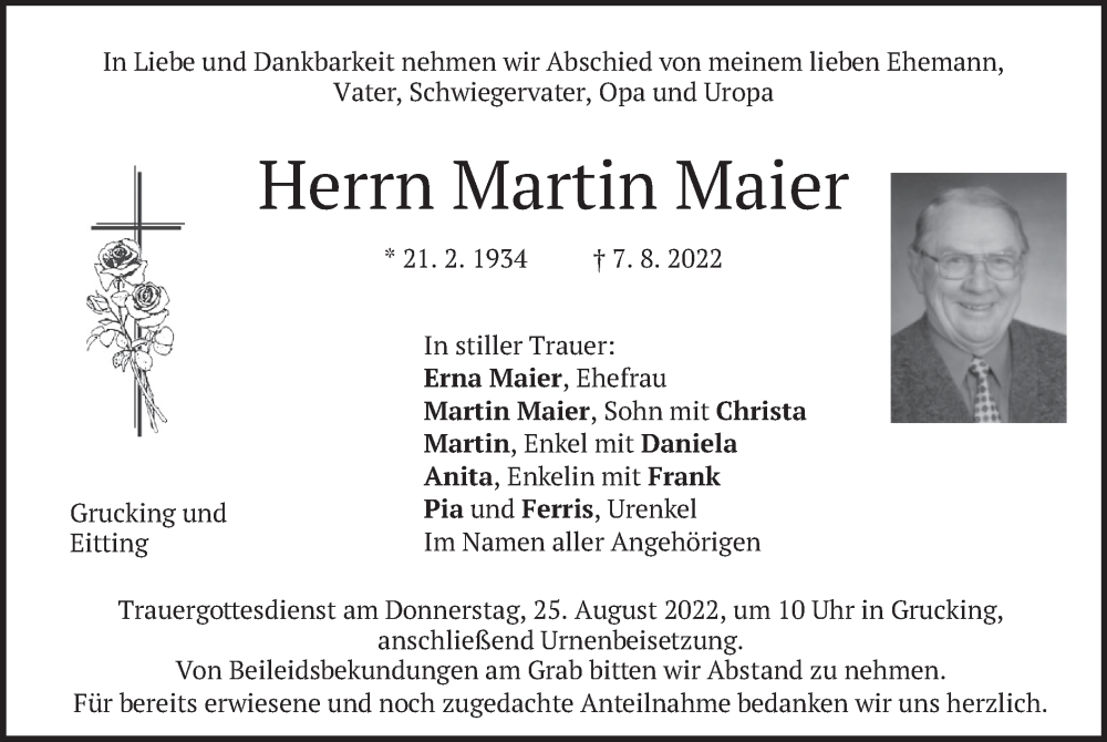 Hier finden Sie alle Traueranzeigen aus der Zeitung, die bisher für Martin Maier erschienen sind. Weitere Traueranzeigen, die in der Zeitung erscheinen, werden hier ebenfalls aufgelistet