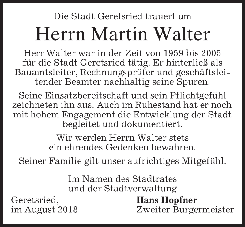 Hier finden Sie alle Traueranzeigen aus der Zeitung, die bisher für Martin Walter erschienen sind. Weitere Traueranzeigen, die in der Zeitung erscheinen, werden hier ebenfalls aufgelistet