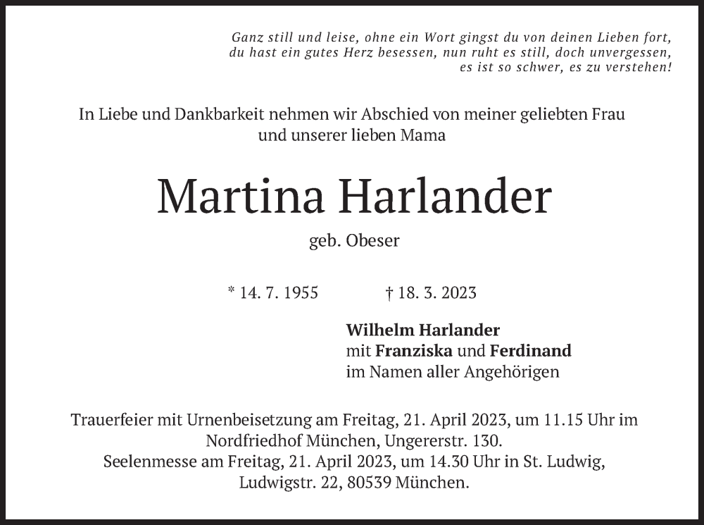 Hier finden Sie alle Traueranzeigen aus der Zeitung, die bisher für Martina Harlander erschienen sind. Weitere Traueranzeigen, die in der Zeitung erscheinen, werden hier ebenfalls aufgelistet