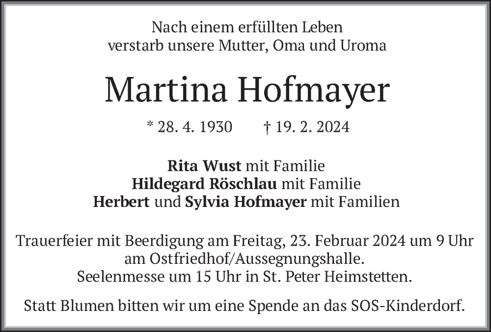 Hier finden Sie alle Traueranzeigen aus der Zeitung, die bisher für Martina Hofmayer erschienen sind. Weitere Traueranzeigen, die in der Zeitung erscheinen, werden hier ebenfalls aufgelistet