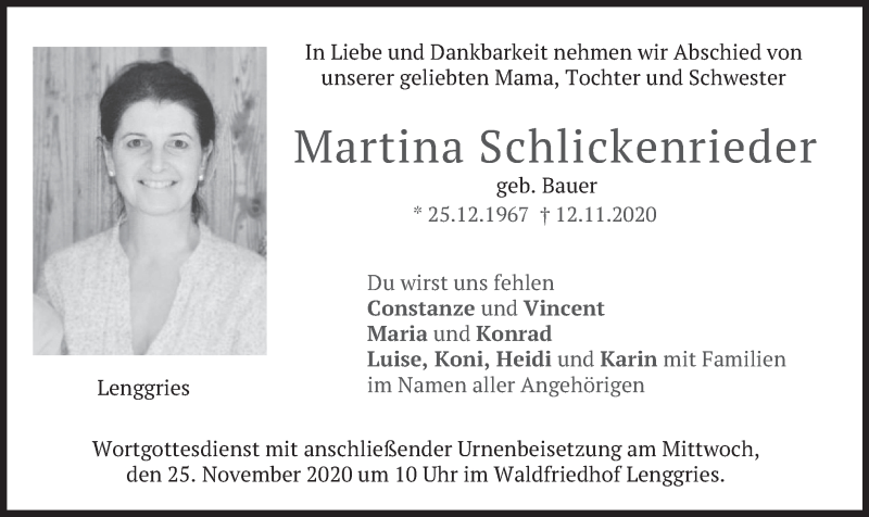 Hier finden Sie alle Traueranzeigen aus der Zeitung, die bisher für Martina Schlickenrieder erschienen sind. Weitere Traueranzeigen, die in der Zeitung erscheinen, werden hier ebenfalls aufgelistet