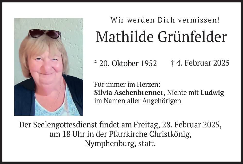 Hier finden Sie alle Traueranzeigen aus der Zeitung, die bisher für Mathilde Grünfelder erschienen sind. Weitere Traueranzeigen, die in der Zeitung erscheinen, werden hier ebenfalls aufgelistet