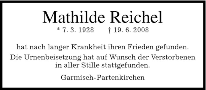 Hier finden Sie alle Traueranzeigen aus der Zeitung, die bisher für Mathilde Reichel erschienen sind. Weitere Traueranzeigen, die in der Zeitung erscheinen, werden hier ebenfalls aufgelistet