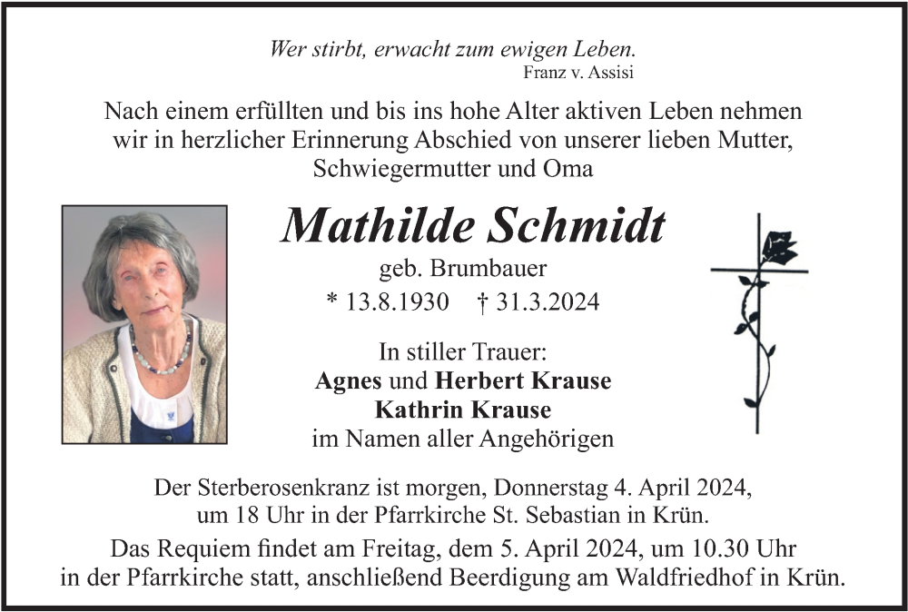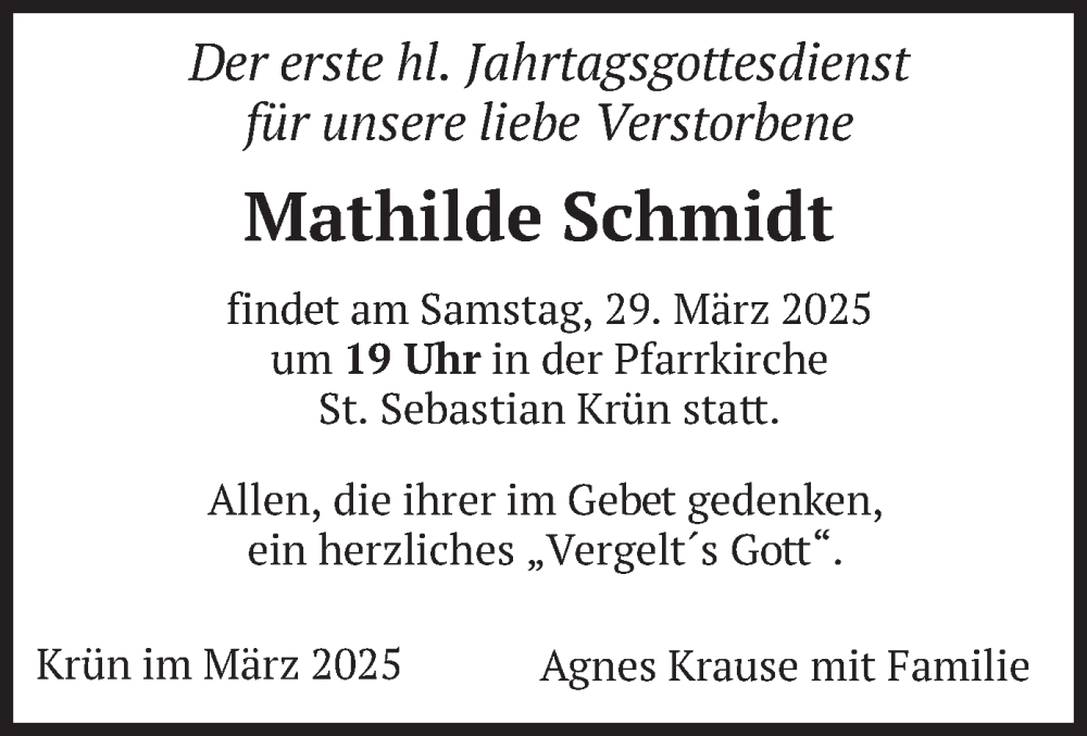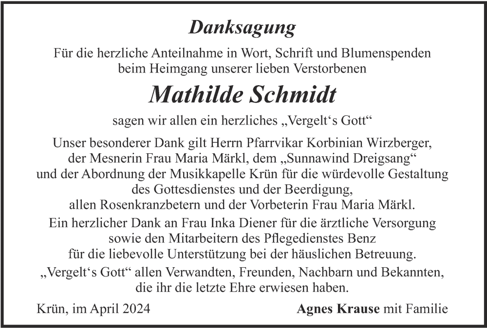 Hier finden Sie alle Traueranzeigen aus der Zeitung, die bisher für Mathilde Schmidt erschienen sind. Weitere Traueranzeigen, die in der Zeitung erscheinen, werden hier ebenfalls aufgelistet