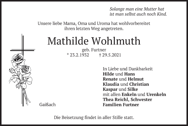Hier finden Sie alle Traueranzeigen aus der Zeitung, die bisher für Mathilde Wohlmuth erschienen sind. Weitere Traueranzeigen, die in der Zeitung erscheinen, werden hier ebenfalls aufgelistet