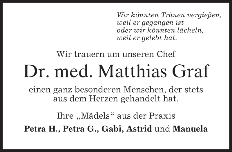 Hier finden Sie alle Traueranzeigen aus der Zeitung, die bisher für Matthias Graf erschienen sind. Weitere Traueranzeigen, die in der Zeitung erscheinen, werden hier ebenfalls aufgelistet