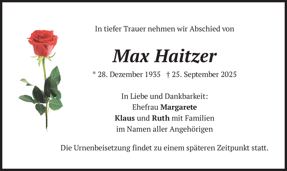 Hier finden Sie alle Traueranzeigen aus der Zeitung, die bisher für Max Haitzer erschienen sind. Weitere Traueranzeigen, die in der Zeitung erscheinen, werden hier ebenfalls aufgelistet