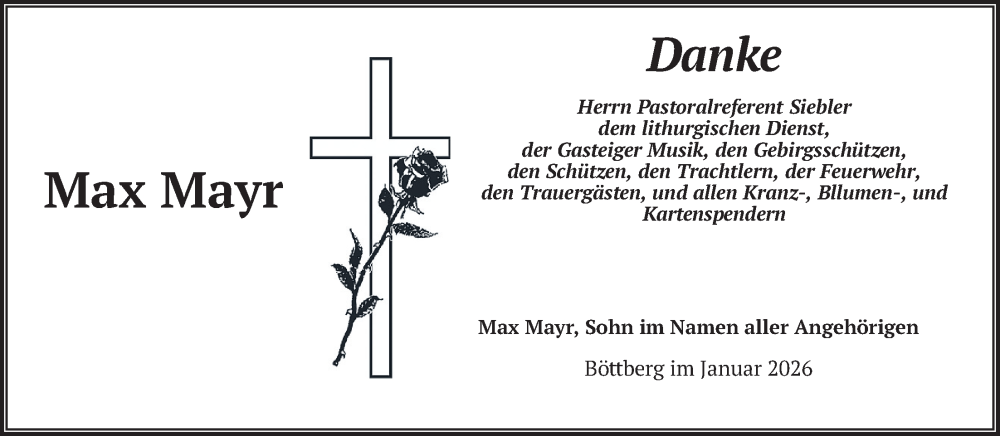 Hier finden Sie alle Traueranzeigen aus der Zeitung, die bisher für Max Mayr erschienen sind. Weitere Traueranzeigen, die in der Zeitung erscheinen, werden hier ebenfalls aufgelistet