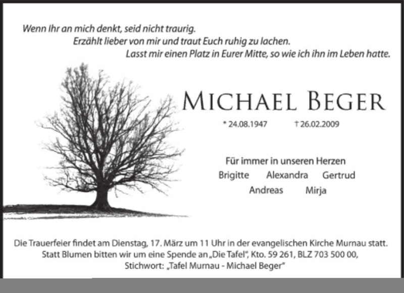 Hier finden Sie alle Traueranzeigen aus der Zeitung, die bisher für Michael Beger erschienen sind. Weitere Traueranzeigen, die in der Zeitung erscheinen, werden hier ebenfalls aufgelistet