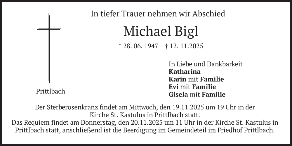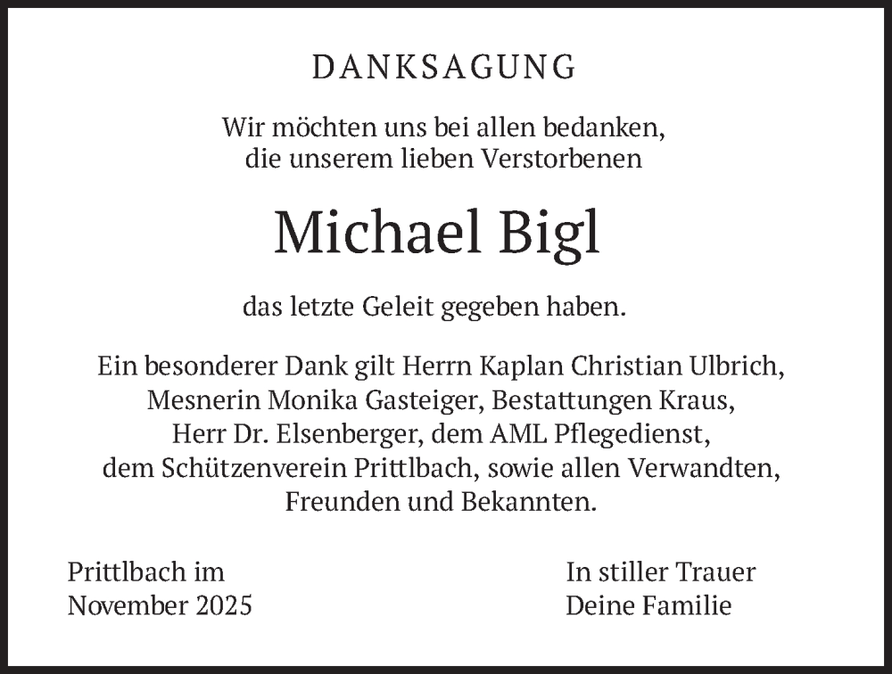 Hier finden Sie alle Traueranzeigen aus der Zeitung, die bisher für Michael Bigl erschienen sind. Weitere Traueranzeigen, die in der Zeitung erscheinen, werden hier ebenfalls aufgelistet