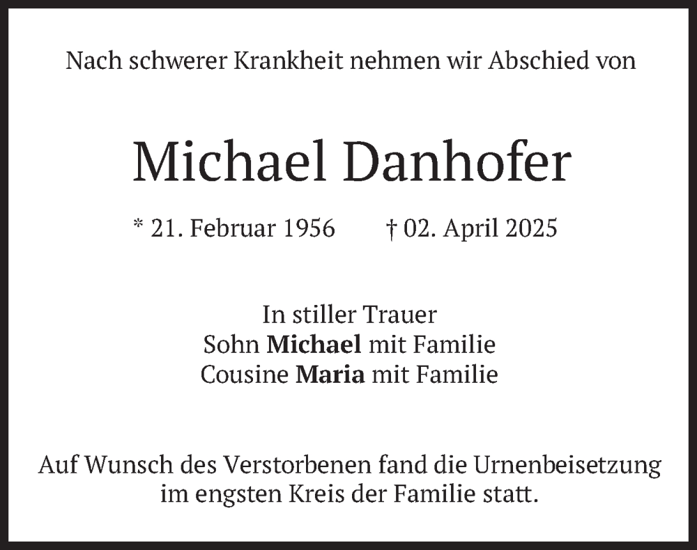 Hier finden Sie alle Traueranzeigen aus der Zeitung, die bisher für Michael Danhofer erschienen sind. Weitere Traueranzeigen, die in der Zeitung erscheinen, werden hier ebenfalls aufgelistet