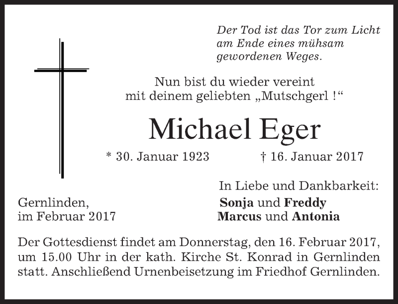 Hier finden Sie alle Traueranzeigen aus der Zeitung, die bisher für Michael Eger erschienen sind. Weitere Traueranzeigen, die in der Zeitung erscheinen, werden hier ebenfalls aufgelistet