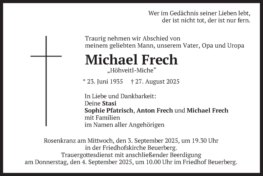 Hier finden Sie alle Traueranzeigen aus der Zeitung, die bisher für Michael Frech erschienen sind. Weitere Traueranzeigen, die in der Zeitung erscheinen, werden hier ebenfalls aufgelistet