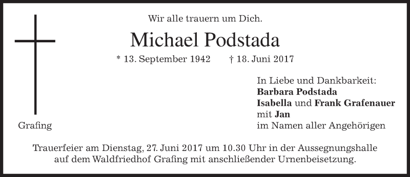 Hier finden Sie alle Traueranzeigen aus der Zeitung, die bisher für Michael Podstada erschienen sind. Weitere Traueranzeigen, die in der Zeitung erscheinen, werden hier ebenfalls aufgelistet