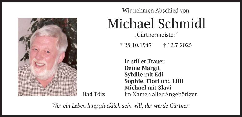 Hier finden Sie alle Traueranzeigen aus der Zeitung, die bisher für Michael Schmidl erschienen sind. Weitere Traueranzeigen, die in der Zeitung erscheinen, werden hier ebenfalls aufgelistet