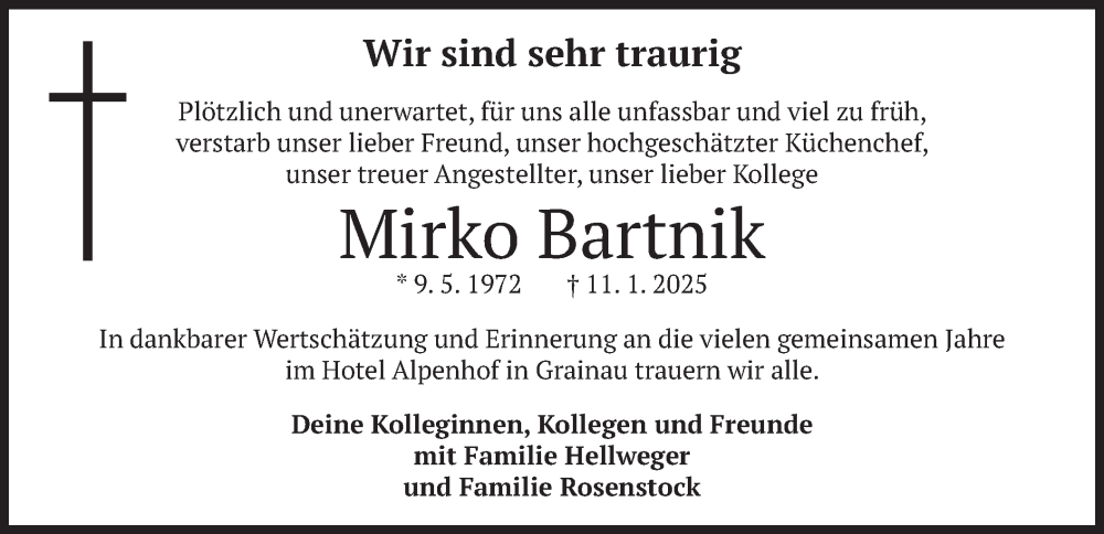 Hier finden Sie alle Traueranzeigen aus der Zeitung, die bisher für Mirko Bartnik erschienen sind. Weitere Traueranzeigen, die in der Zeitung erscheinen, werden hier ebenfalls aufgelistet