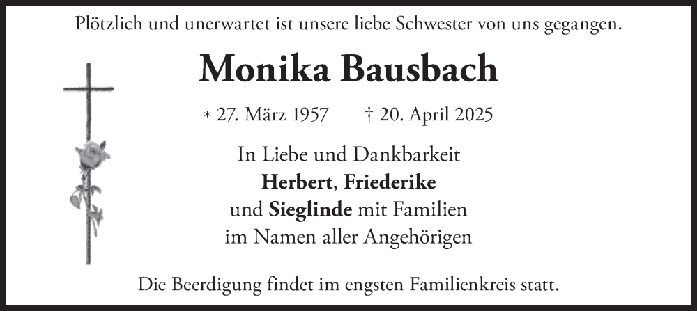 Hier finden Sie alle Traueranzeigen aus der Zeitung, die bisher für Monika Bausbach erschienen sind. Weitere Traueranzeigen, die in der Zeitung erscheinen, werden hier ebenfalls aufgelistet