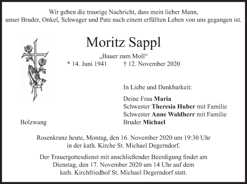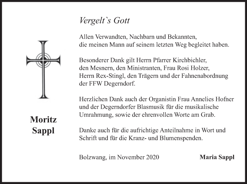 Hier finden Sie alle Traueranzeigen aus der Zeitung, die bisher für Moritz Sappl erschienen sind. Weitere Traueranzeigen, die in der Zeitung erscheinen, werden hier ebenfalls aufgelistet