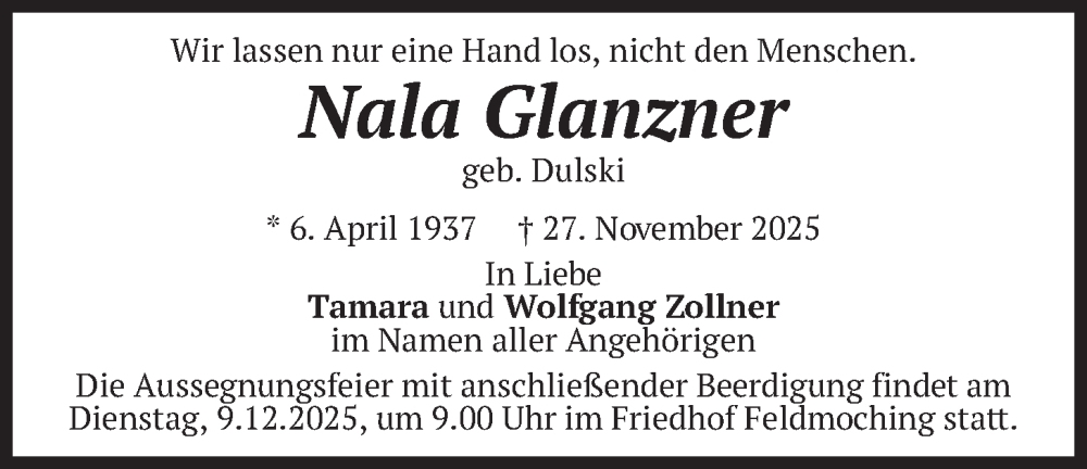 Hier finden Sie alle Traueranzeigen aus der Zeitung, die bisher für Nala Glanzner erschienen sind. Weitere Traueranzeigen, die in der Zeitung erscheinen, werden hier ebenfalls aufgelistet