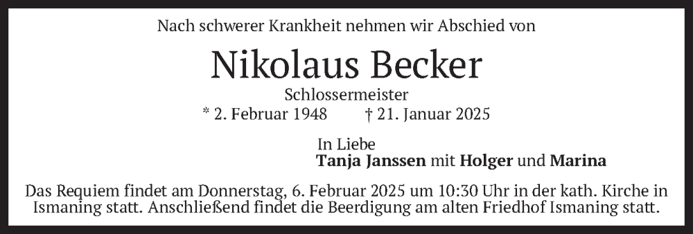 Hier finden Sie alle Traueranzeigen aus der Zeitung, die bisher für Nikolaus Becker erschienen sind. Weitere Traueranzeigen, die in der Zeitung erscheinen, werden hier ebenfalls aufgelistet