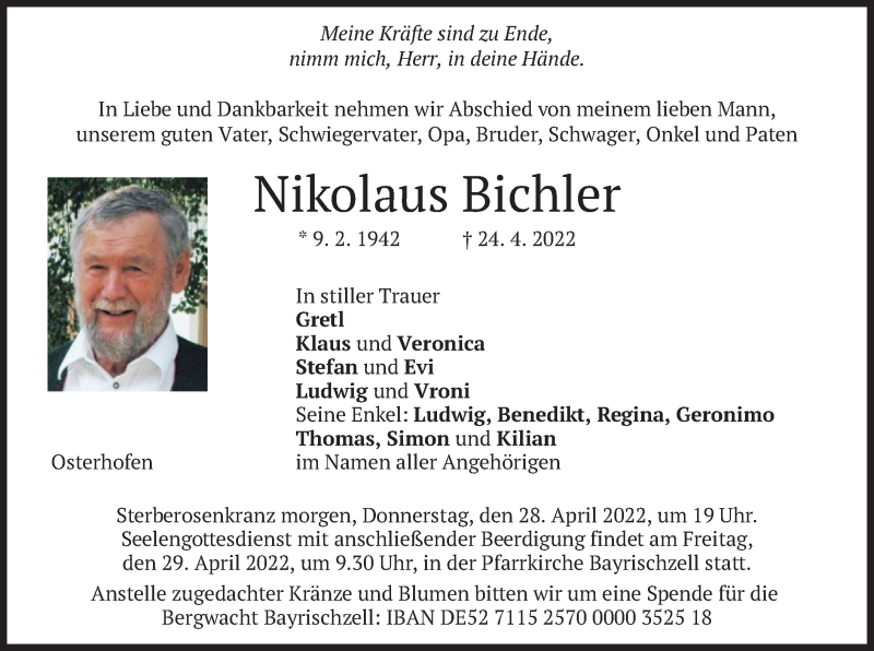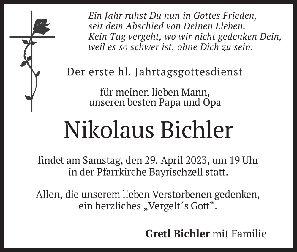 Hier finden Sie alle Traueranzeigen aus der Zeitung, die bisher für Nikolaus Bichler erschienen sind. Weitere Traueranzeigen, die in der Zeitung erscheinen, werden hier ebenfalls aufgelistet