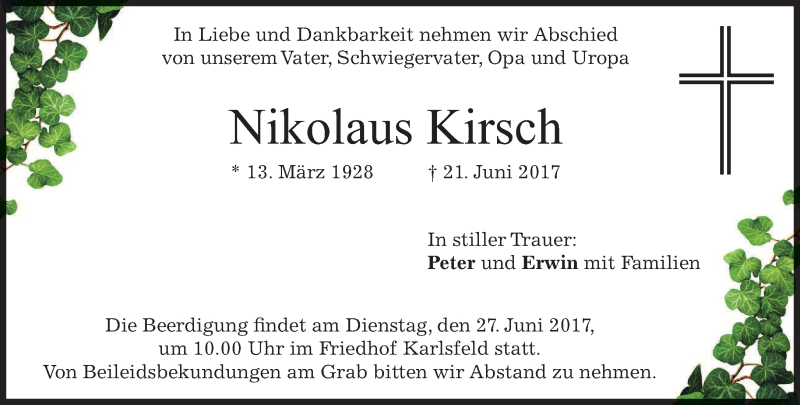 Hier finden Sie alle Traueranzeigen aus der Zeitung, die bisher für Nikolaus Kirsch erschienen sind. Weitere Traueranzeigen, die in der Zeitung erscheinen, werden hier ebenfalls aufgelistet