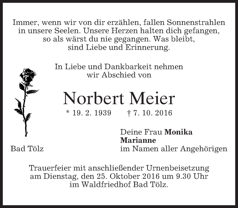 Hier finden Sie alle Traueranzeigen aus der Zeitung, die bisher für Norbert Meier erschienen sind. Weitere Traueranzeigen, die in der Zeitung erscheinen, werden hier ebenfalls aufgelistet