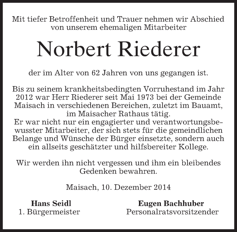 Hier finden Sie alle Traueranzeigen aus der Zeitung, die bisher für Norbert Riederer erschienen sind. Weitere Traueranzeigen, die in der Zeitung erscheinen, werden hier ebenfalls aufgelistet