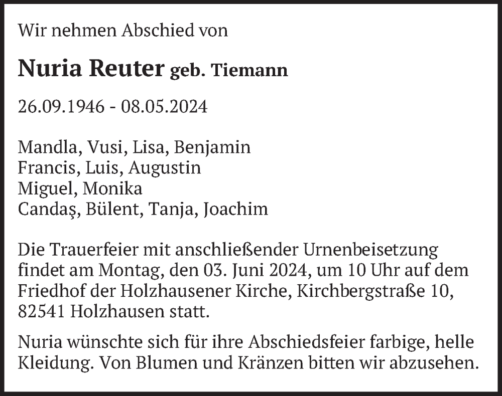 Hier finden Sie alle Traueranzeigen aus der Zeitung, die bisher für Nuria Reuter erschienen sind. Weitere Traueranzeigen, die in der Zeitung erscheinen, werden hier ebenfalls aufgelistet