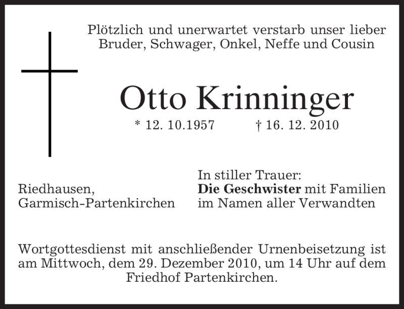 Hier finden Sie alle Traueranzeigen aus der Zeitung, die bisher für Otto Krinninger erschienen sind. Weitere Traueranzeigen, die in der Zeitung erscheinen, werden hier ebenfalls aufgelistet