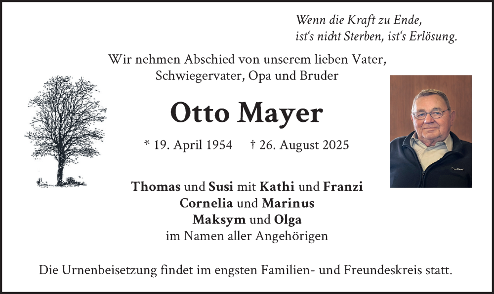 Hier finden Sie alle Traueranzeigen aus der Zeitung, die bisher für Otto Mayer erschienen sind. Weitere Traueranzeigen, die in der Zeitung erscheinen, werden hier ebenfalls aufgelistet
